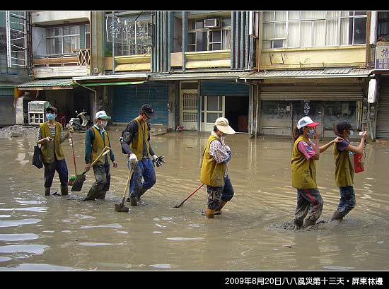 聽到老媽的催促聲,趕緊整裝下樓和鄰居會合,今天麗莎要去屏東災區幫忙做清掃工作